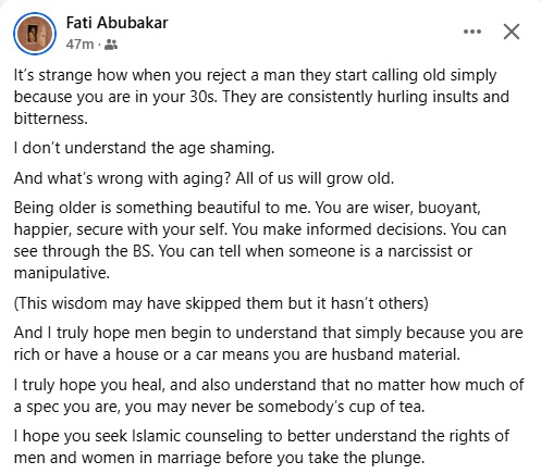 In a recent post, Abubakar pointed out that certain men resort to age-shaming women after being turned down romantically. She emphasized that growing older is a natural and beautiful part of life that everyone will experience.