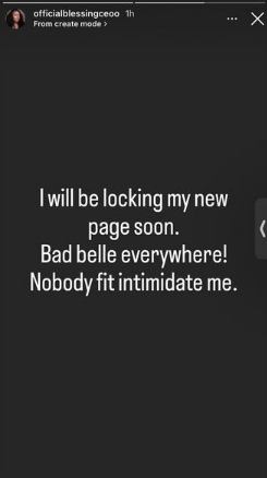 “I will be locking my new page soon. Bad belle everywhere. Nobody fit intimidate me”.