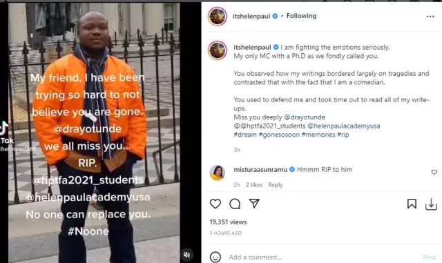 Popular Nigerian comedienne Helen Paul has been thrown into mourning as it seems to be a very sad period for following the death of her friend, and she has taken to social media to mourn him.