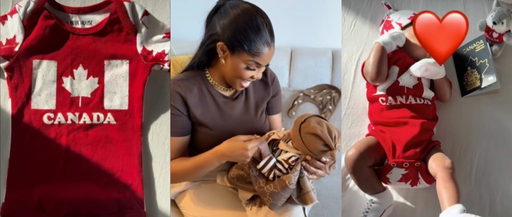 In a video, a red baby outfit boldly inscribed with “Canada” was displayed, before the newborn was spotted lying beside it with his fresh passport.