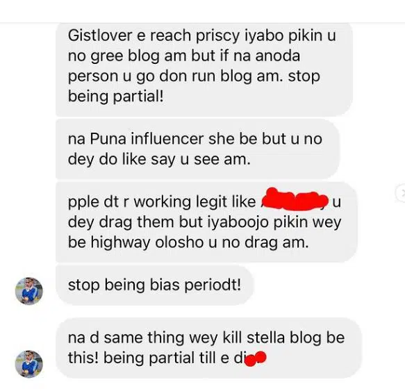 The thespian’s response came after the popular IG blog, Gistlovers shared a screenshot of the message it received from an IG user that fumed over the fact that Priscilla Ojo’s relationship saga with Kizz Daniel wasn’t thrashed on the blog.