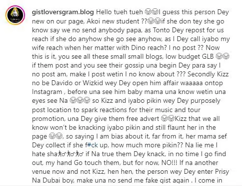 “Hello tueh tueh 😂😂I guess this person Dey new on our page, Akoi new student ??😂😂if she don tey she go know say we no send anybody papa, as Tonto Dey repost for us reach if she do anyhow she go see anyhow, as I Dey call iyabo my wife reach when her matter with Dino reach? I no post ?? Now this is it, you see all these small small blogs, low budget GLB 😂😂if them post and you see their gossip una begin Dey para say I no post am, make I post wetin I no know about ??? Secondly Kizz no be Davido or Wizkid wey Dey open him affair waaaaa ontop Instagram , before una see him baby mama una know wetin una eyes see Na 😂😂😂 so Kizz and iyabo pikin wey Dey purposely post location to spark reactions for their music and tour promotion, una Dey give them free advert 😂😂Kizz that we all know won’t be knacking iyabo pikin and still flaunt her in the page 😂😂, so saying I am bias about it, far from it, her mama sef Dey collect if she f#ck up, how much more pikin?? Na lie me I hate sha🚶♂️🚶♂️🚶♂️ if Na true them Dey knack, in no time I go find out, my hand Go touch them, but for now, NO!!! If na another venue now and not Kizz, hen hen, the person wey Dey enter Prisy Na Dubai boy, make una no send me fake gist again. I come in peace”