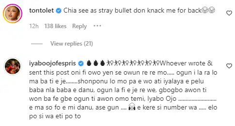 Iyabo Ojo however took to the comment section of the post to rain curses on the netizen that sent the demeaning information about her daughter.