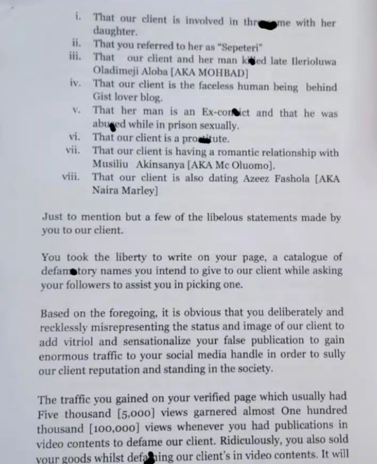 Based on the foregoing, it is obvious that you deliberately and recklessly misrepresenting the status and image of our client to add vitriol and sensationalize your false publication to gain enormous traffic to your social media handle in order to sully our client reputation and standing in the society.”
