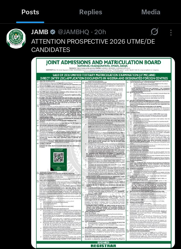 The Joint Admissions and Matriculation Board (JAMB) has announced the commencement of application sales for the 2026 Unified Tertiary Matriculation Examination (UTME) and Direct Entry (DE) admissions for the 2026/2027 academic session.