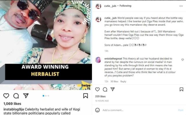 Controversial Blogger, Cutie__juls exposes the deed of Instagram dancer, Janemena and popular herbalist while accusing them of bottling up Mr Plies (Janemena’s husband) via charms.