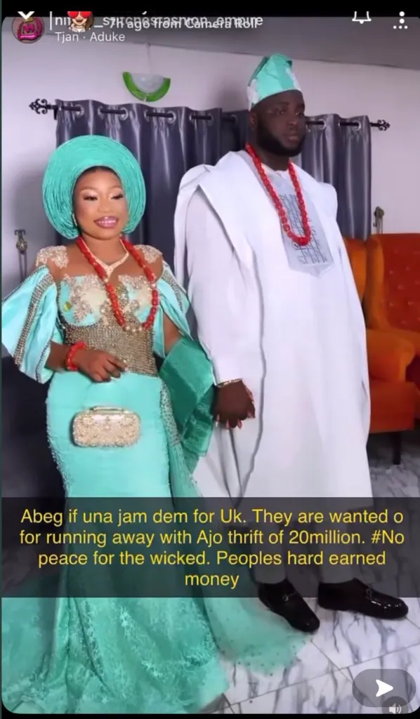 ”Abeg if you jam dem for UK. They are wanted for running away with Ajo thrift of 20million. No peace for the weekend. Peoples hard earned money.”