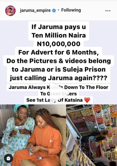 “if Jaruma pays u Ten million naira, N10,000,000 for advert for 6 months, do the pictures and videos belong to Jaruma or is Suleja prison just calling Jaruma again???”