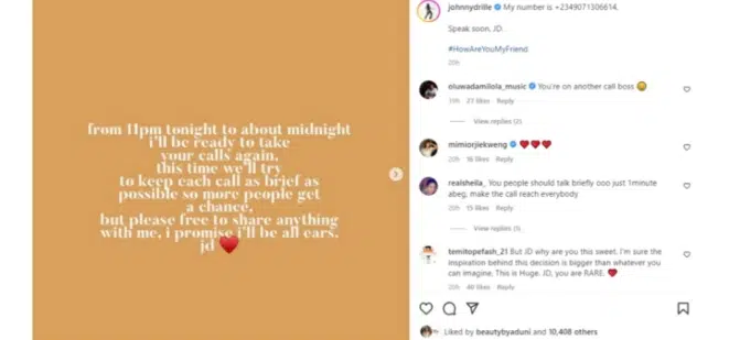 - Johnny Drille In the spirit of his latest single ‘How Are You My Friend‘, posted his phone number via Instagram