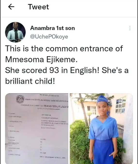 @UchePOkoye made public the results of the brilliant girl’s common entrance examination, which showed a combined score of 334.