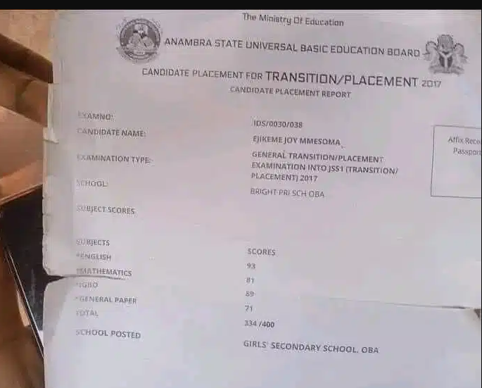 A picture of Joy Ejikeme’s 2017 common entrance examination result sheet has surfaced amid allegations that she manipulated her JAMB score.