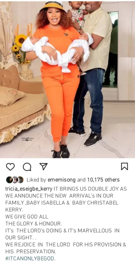 Nollywood actress, Tricia Eseigbe Kerry has welcomed a set of twins.