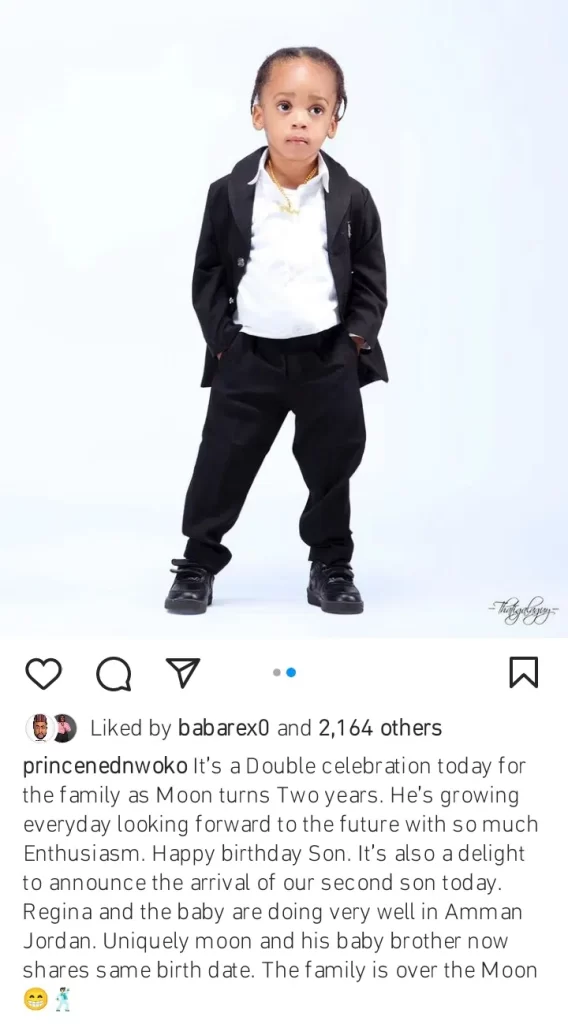 “It’s a double celebration today for the family as Moon turns Two years. He’s growing everyday looking forward to the future with so much enthusiasm. Happy birthday son. It’s also a delight to announce the arrival of our second son today. Regina and the baby are doing well in Amman Jordan. Uniquely moon and his baby brother now shares same birth date. Yeh family is over the Moon”.