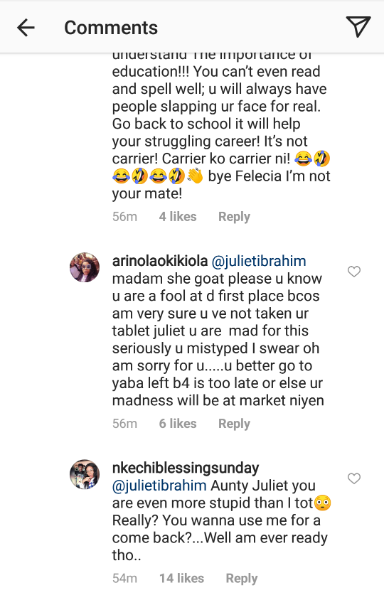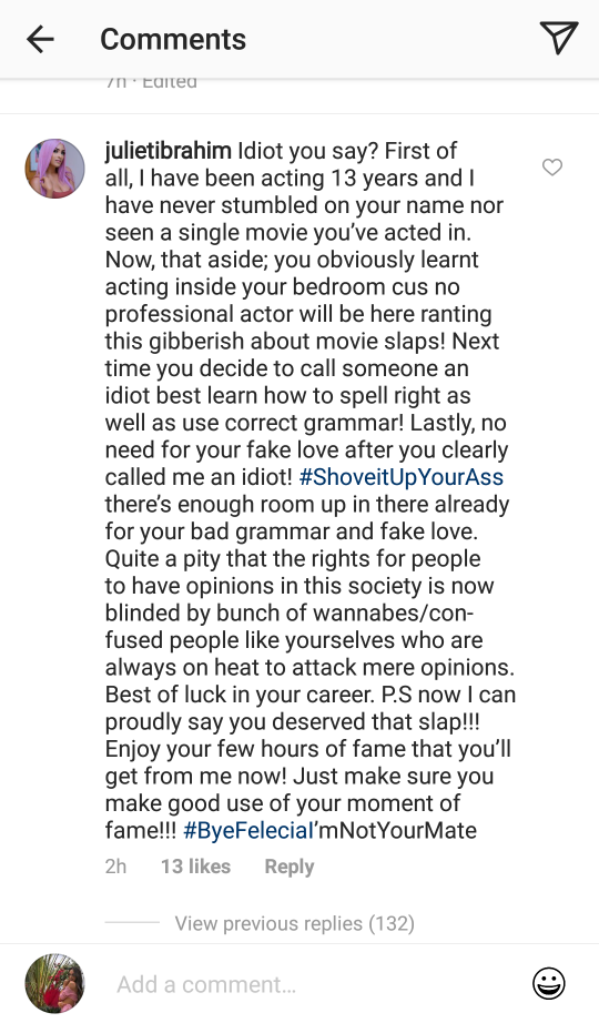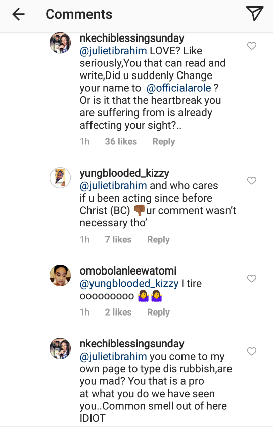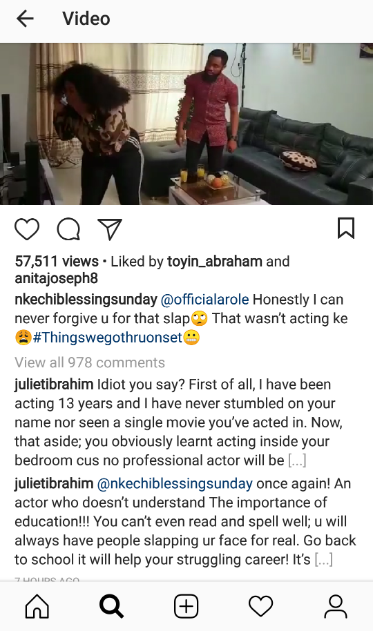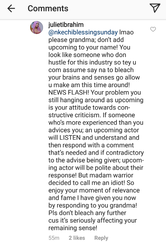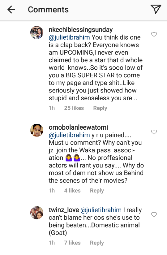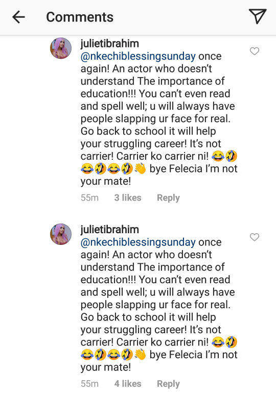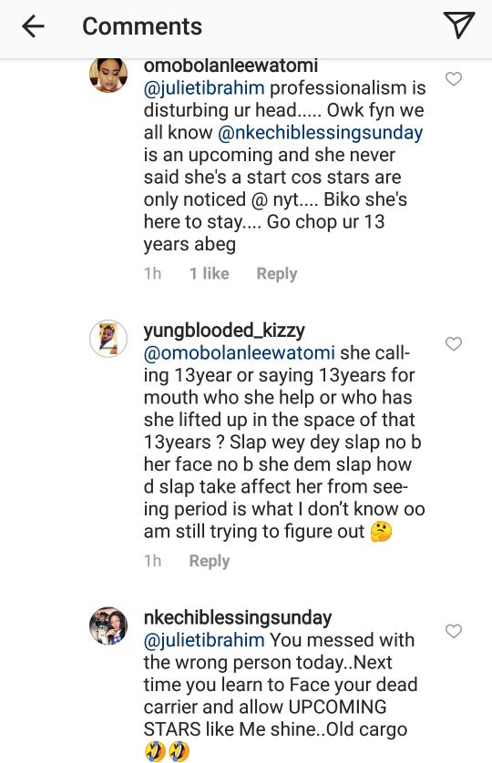 Yesterday Nigerian actress Nkechi Blessing Sunday uploaded a video where another actress slapped her real in a movie, fans dropped normal comments but Ghanaian actress Juliet Ibrahim kinda took it serious and the result? Juliet was stripped with cusses on the instagram