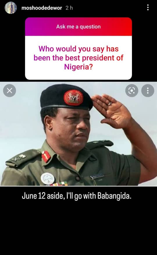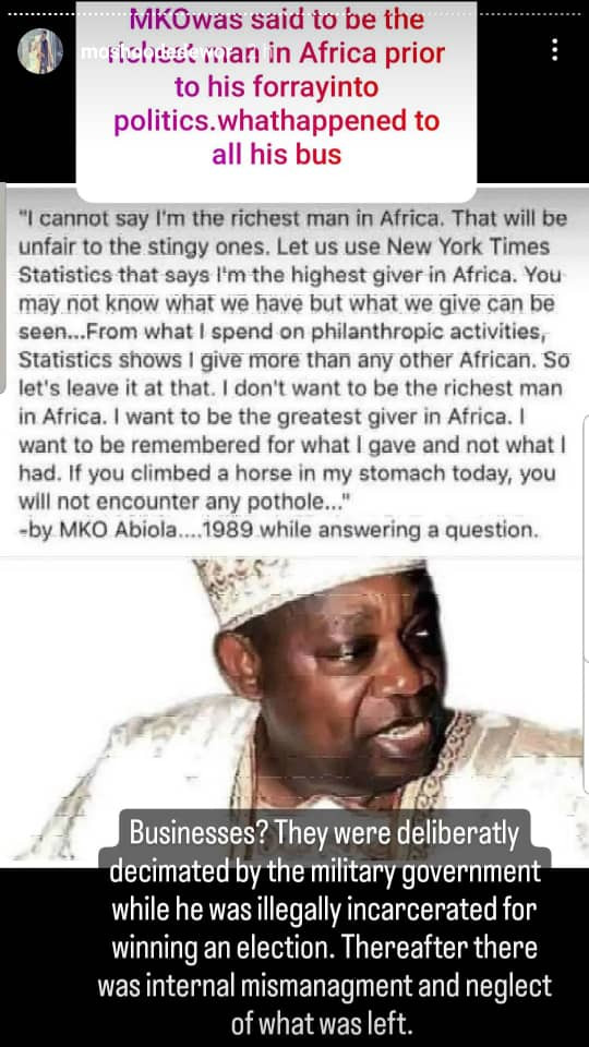 In a question and answer session with his followers on Instagram on Sunday, July 31,Moshood was asked who in his opinion is the best President of Nigeria and he responded Babangida. He also wrote about what happened to the businesses MKO had while he was alive.