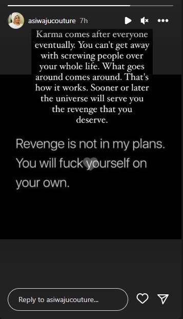 The mother of four took to her Instagram story a few hours ago where she shared a cryptic post about Karma visiting people for their wrong deeds despite how long it may take.