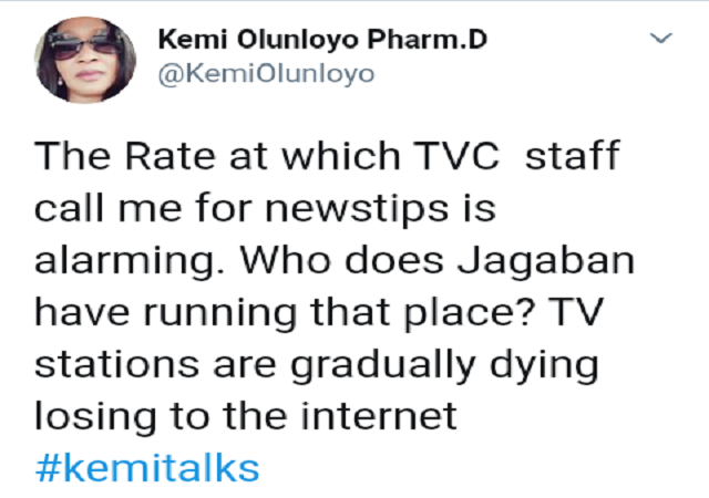 “The rate at which TVC staff call me for news tips is alarming. Who does jagaban have running that place? TV stations are gradually dying losing to the internet #kemitalks