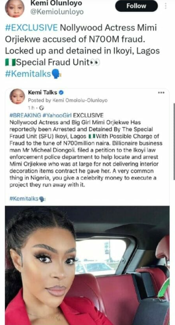According to investigative journalist Kemi Olunloyo, Nollywood actress Mimi Orjiekwe has been arrested by Nigerian police for N700 million fraud.