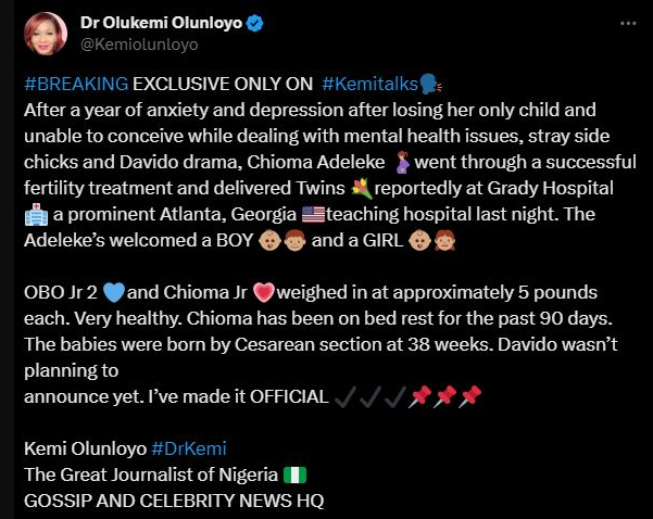 Kemi Olunloyo, a controversial journalist, elaborates on the viral news about Davido and Chioma welcoming twins.
