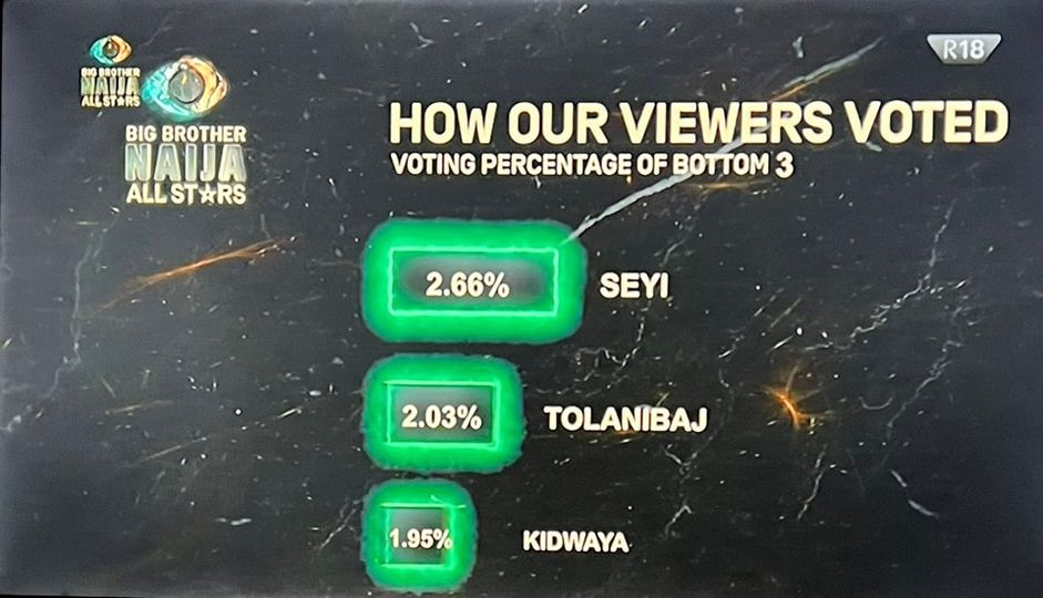 Amongst the bottom 3 housemates, Seyi Awolowo had the highest votes, followed by Tolanibaj, and lastly Kiddwaya.