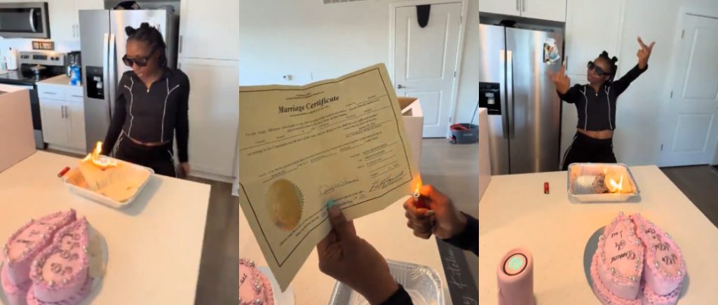 In a video that has since gone viral, the woman was seen setting her marriage certificate on fire, symbolising the end of her marriage. She later marked the moment by cutting a cake, celebrating what she described as a new phase of her life.