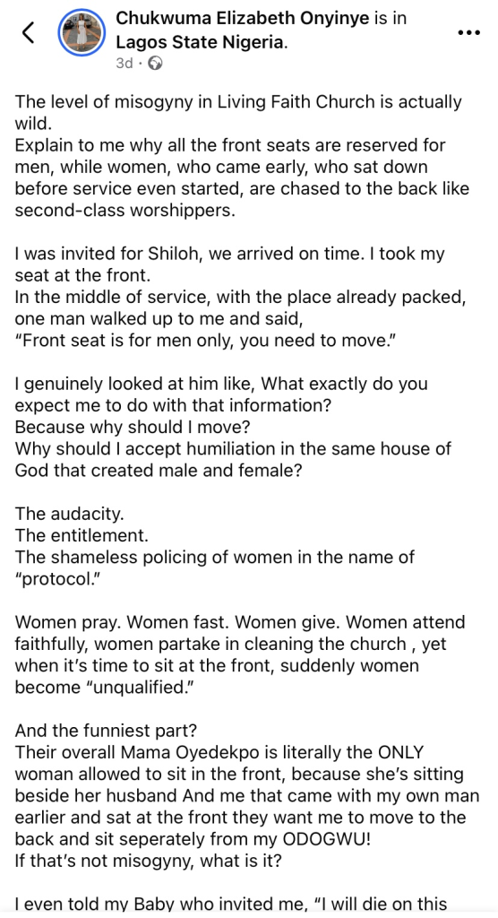 Taking to Facebook, Onyinye accused the church of promoting misogyny and gender segregation, particularly through its seating arrangements during services.
