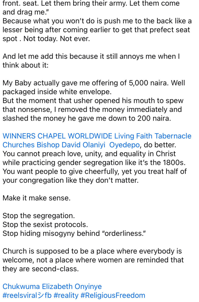 Another concern she raised was what she described as a double standard in the seating arrangement. According to her, only Bishop David Oyedepo’s wife is allowed to sit at the front. She stated: