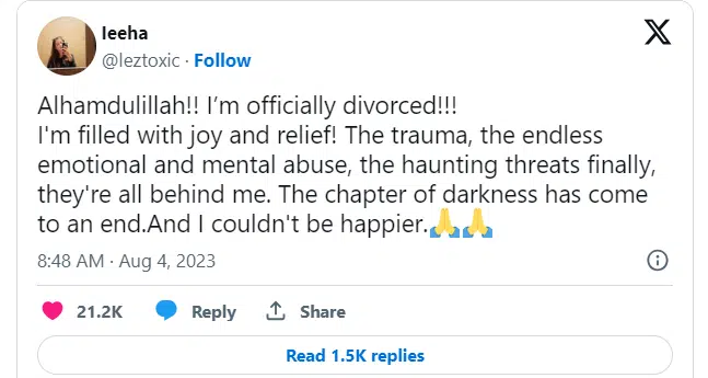 “Alhamdulillah!! I’m officially divorced!!! I’m filled with joy and relief! The trauma, the endless emotional and mental abuse, the haunting threats finally, they’re all behind me. The chapter of darkness has come to an end. And I couldn’t be happier.🙏🙏“