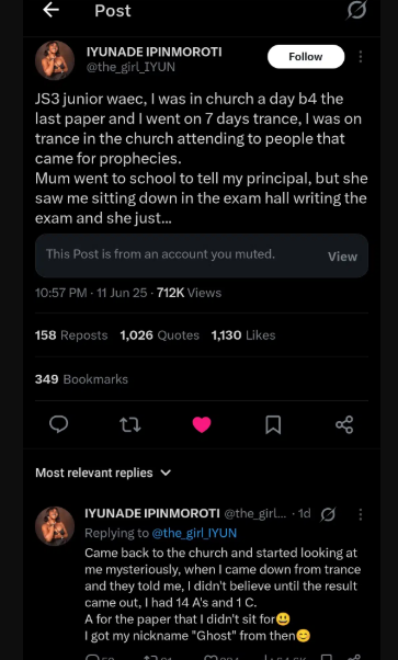 - A Nigerian lady passed her Junior WAEC examination with 14 A’s and 1 C, despite not physically sitting for seven days due to a trance.