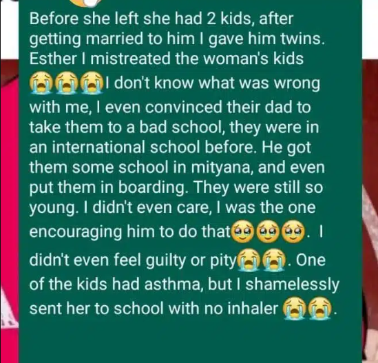 Before she left she had 2 kids, after getting married to him I gave him twins. Esther I mistreated the woman’s kids don’t know what was wrong with me, I even convinced their dad to take them to a bad school, they were in an international school before. He got them some school in mityana, and even put them in boarding. They were still so young. I didn’t even care, I was the one encouraging him to do that I didn’t even feel guilty or pity) One of the kids had asthma, but I shamelessly sent her to school with no inhaler.