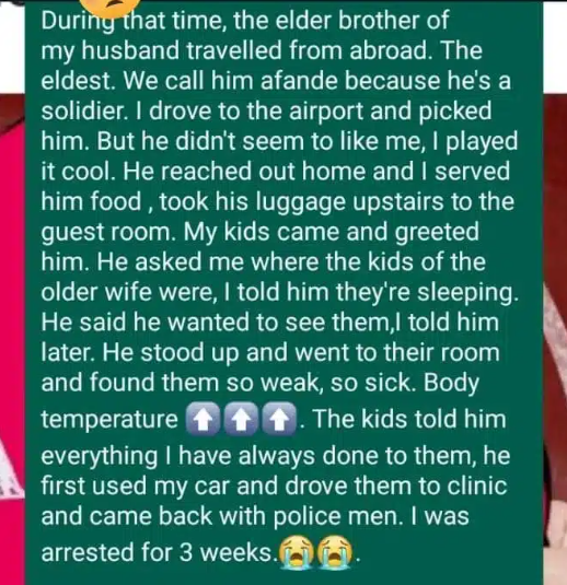 During that time, the elder brother of my husband travelled from abroad. The eldest. We call him afande because he’s a solidier. I drove to the airport and picked him. But he didn’t seem to like me, I played it cool. He reached out home and I served him food , took his luggage upstairs to the guest room. My kids came and greeted him. He asked me where the kids of the older wife were, I told him they’re sleeping.