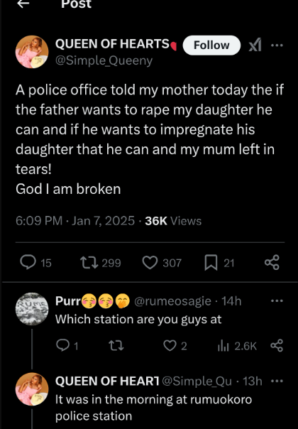 A Nigerian lady has sparked outrage online by sharing a painful remark made about her daughter by an officer at Rumuokoro Police Station, which made her mother cry.