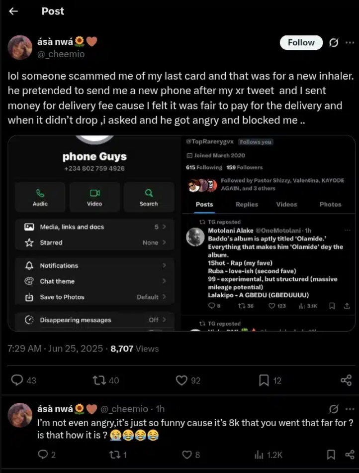 “Lol, someone scammed me of my last card, and that was for a new inhaler,” she wrote. “He pretended to send me a new phone after my XR tweet, and I sent money for the delivery fee ’cause I felt it was fair to pay for it. When it didn’t drop, I asked, and he got angry and blocked me.”