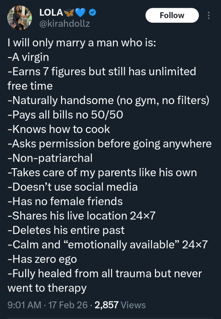 A Nigerian lady has ignited intense online discussions after posting an extensive list of qualities she wants in a future husband.