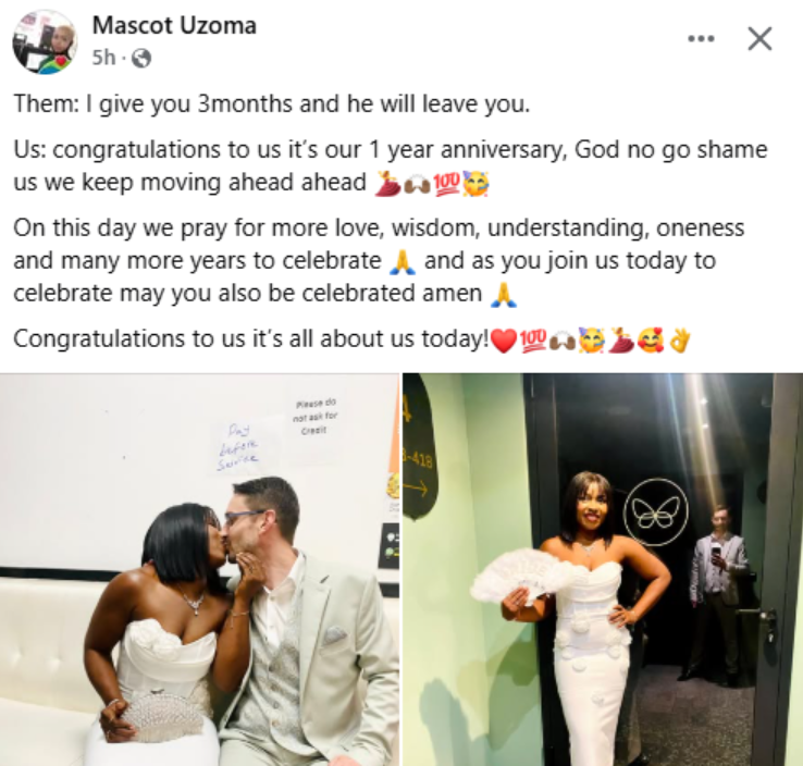 A Nigerian woman, Uzoma, has thrown subtle shade at critics who doubted the longevity of her marriage, marking her one-year wedding anniversary with a triumphant message.