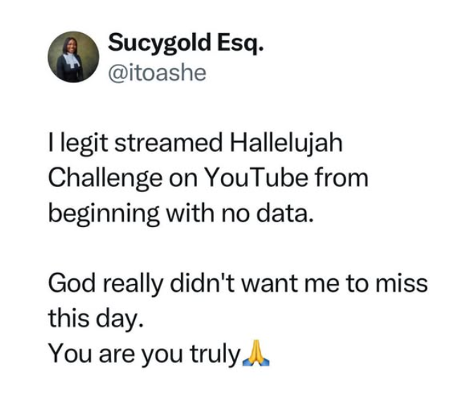 - A Nigerian lady, Sucygold Esq (@itoashe), has gone viral after claiming she streamed the Hallelujah Challenge live on YouTube without having any data.