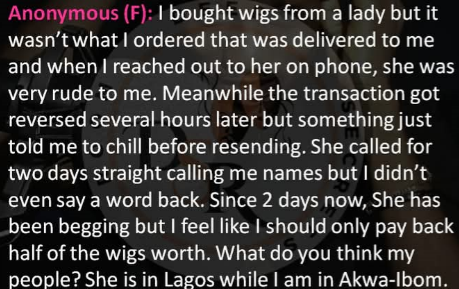 “I bought wigs from a lady but it wasn’t what I ordered that was delivered to me and when I reached out to her on phone, she was very rude to me. Meanwhile the transaction got reversed several hours later but something just told me to chill before resending. She called for two days straight calling me names but | didn’t even say a word back. Since 2 days now, She has been begging but I feel like I should only pay back half of the wigs worth. What do you think my people? She is in Lagos while I am in Akwa-lbom.”