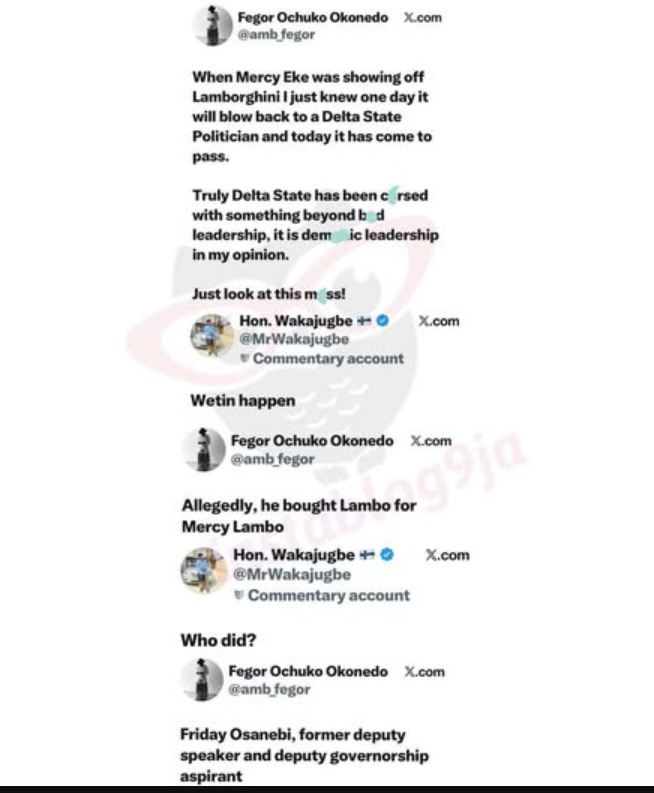 - Social media is abuzz after user Fegor Ochuko Okonedo alleged on X that Mercy Eke’s Lamborghini was allegedly bought by Delta politician Friday Osanebi.