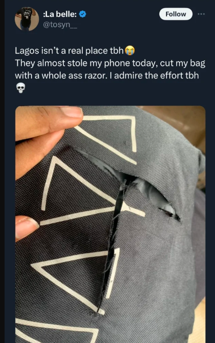@addyxdesign advised: “Normally you don’t go around with this type of bag in Lagos oh😭. It’s easy target . Just switch to leather bags, so sorry you encountered this😂”