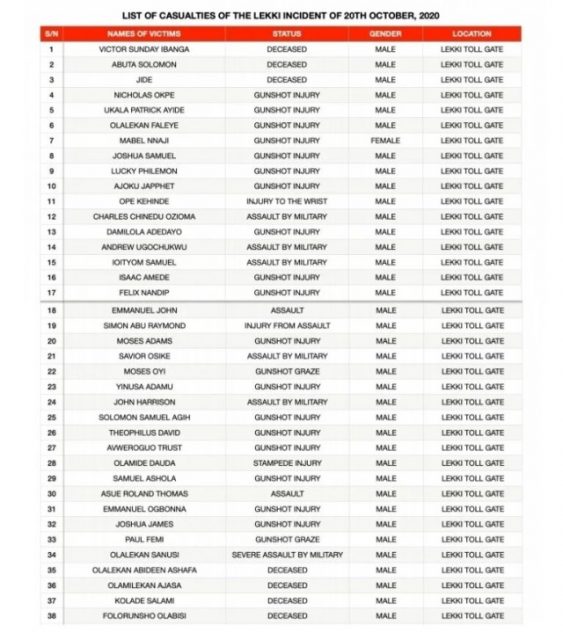 Lagos State Judicial Panel of inquiry into the October 20, 2020 shooting of peaceful protesters at the Lekki Tollgate has released full list of victims.