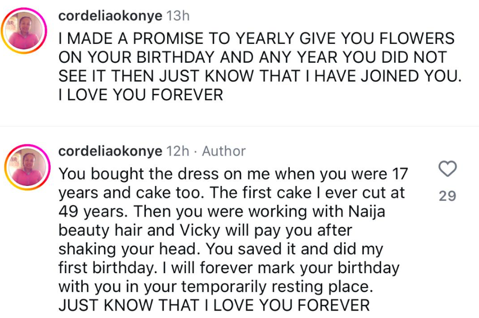 You bought the dress on me when you were 17 years and cake too. The first cake I ever cut at 49 years. Then you were working with Naija beauty hair and Vicky will pay you after shaking your head. You saved it and did my first birthday. I will forever mark your birthday with you in your temporarily resting place. JUST KNOW THAT I LOVE YOU FOREVER” she wrote on her IG page as she shared photos from the visit