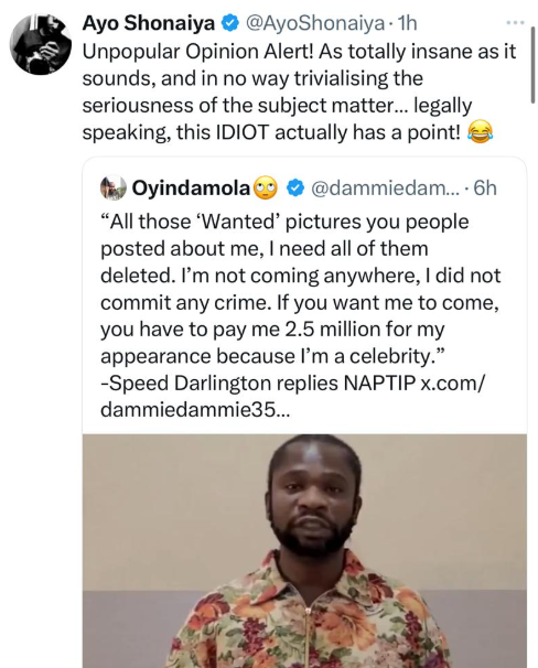 Nigerian lawyer and entertainment consultant, Ayo Shonaiya, has weighed in on the ongoing controversy involving singer Speed Darlington and the National Agency for the Prohibition of Trafficking in Persons (NAPTIP).