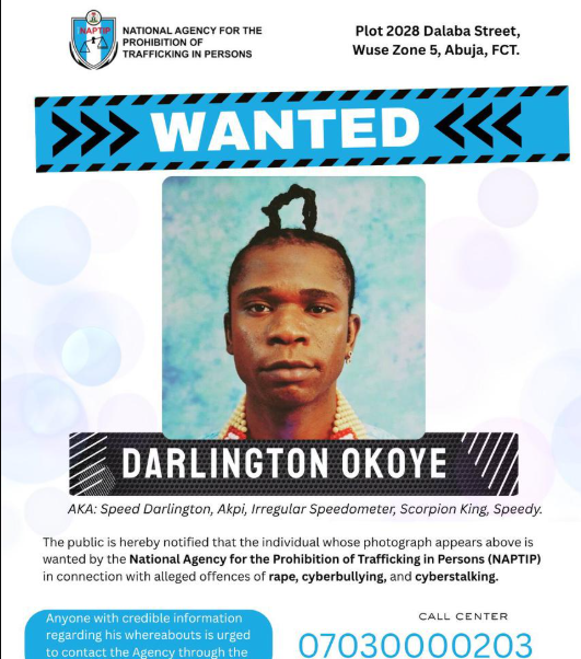 The agency had invited Speed Darlington for questioning after he claimed in an Instagram video that he slept with a 15-year-old virgin girl in a hotel and paid ₦2,000 to a staff member to clean up the blood. Following his refusal to honor multiple invitations, NAPTIP declared him wanted last Friday.