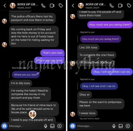 Fast forward, some screenshots have been leaked online where Happie Boys were seen begging for N30K from one of their fans as they claim that the hotel staff are demanding payment.