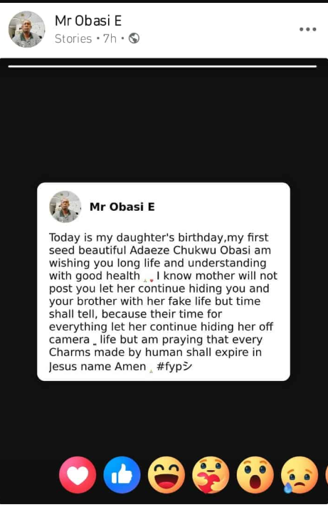 He wrote: “Today is my daughter’s birthday, my first seed, beautiful Adaeze Chukwu Obasi. I wish you long life, understanding, and good health. I know your mother will not post you, let her continue hiding you and your brother with her fake life, but time shall tell, because there is time for everything.”