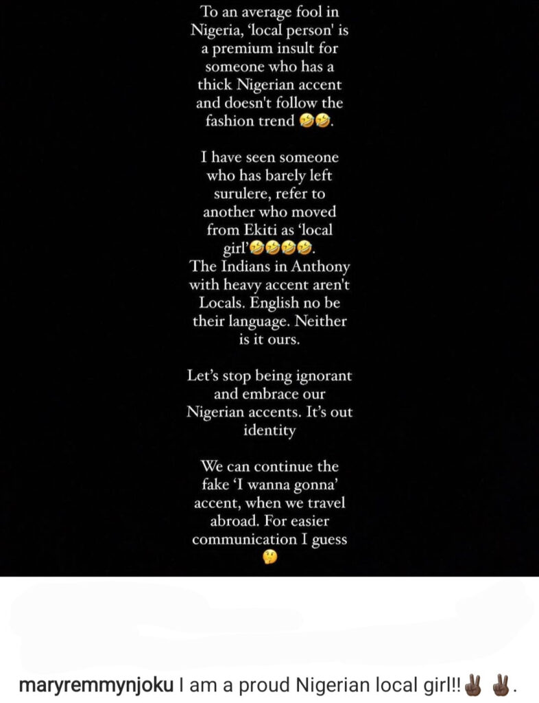 She encouraged Nigerians to embrace their accents and leave the foreign accents for when they travel abroad.