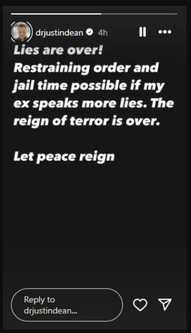 “Lies are over! Restraining order and jail time possible if my ex speaks more lies. The reign of terror is over. Let peace reign”