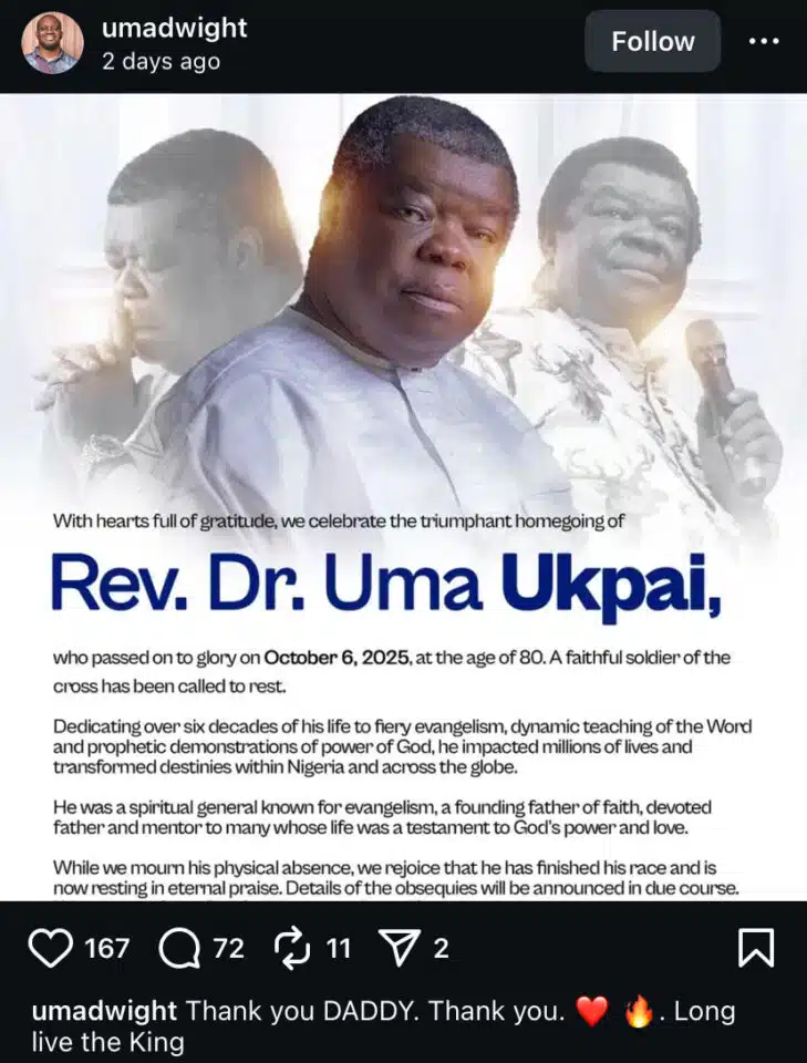 Dwight, the son of the late Nigerian evangelist Dr. Uma Ukpai, has spoken publicly for the first time since his father’s passing, sharing an emotional tribute that moved many online.
