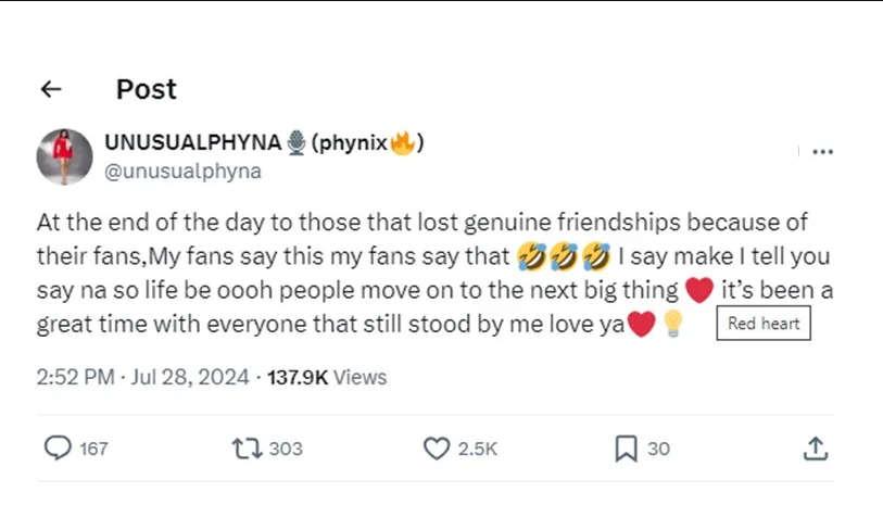 She wrote; “At the end of the day to those that lost genuine friendships because of their fans, My fans say this my fans say that, I say make I tell you say na so life be oooh people move on to the next big thing ❤️ it’s been a great time with everyone that still stood by me love ya❤️💡”
