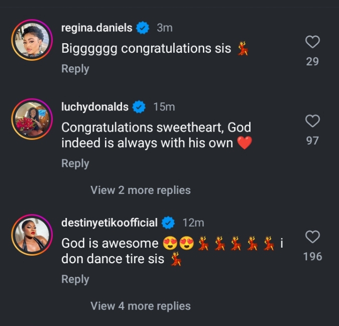 Destiny Etiko wrote “Sis, when you called me and said you’d given birth, I shouted because I know the journey, and I know God has been so good! 💃💃💃 Thanks, God Almighty 🙏🥲. Can’t wait to see our baby! ❤️ Congratulations, once again, my beloved sister! ❤️💃”.